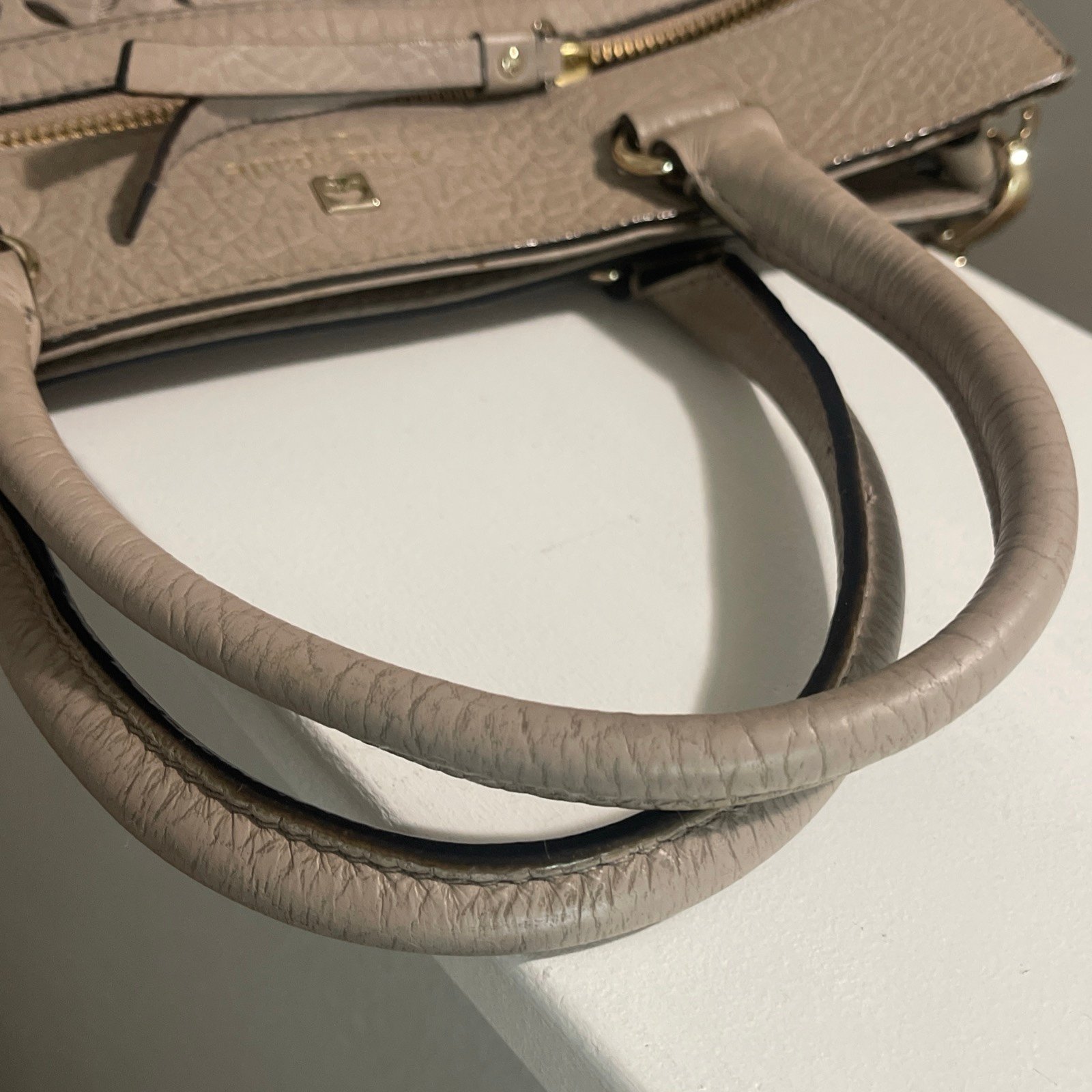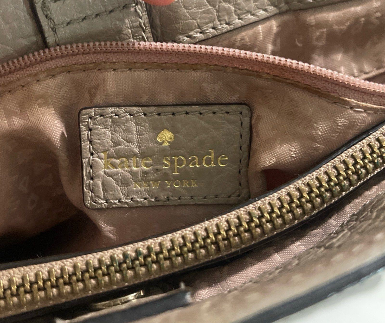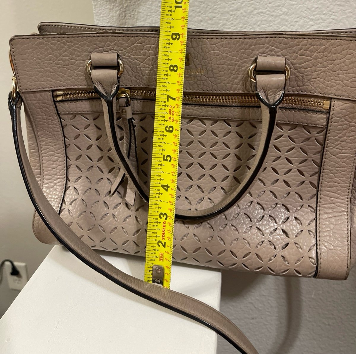 The Kate Spade New York Perri Lane Bubbles Romy Convertible Satchel is a stylish and versatile handbag designed for women. With a sleek beige exterior and gold hardware accents, this satchel exudes sophistication and class. It features a detachable strap for added convenience and can be used for various occasions including travel, parties, casual outings, workwear, and business meetings. Made from leather, this satchel is durable and high-quality, making it a perfect accessory for any fashion-forward woman. Great preowned condition except needs some cleaning. See all pictures
