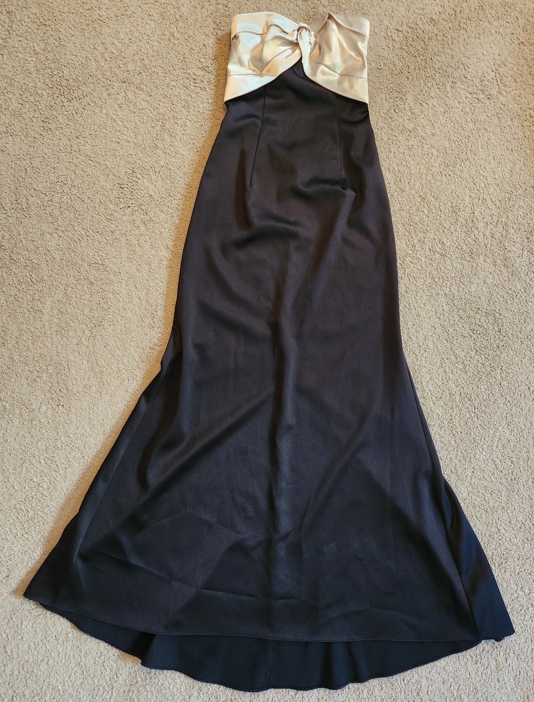 Amazing vintage condition! Juniors size 3 Jessica McClintock for Gunne Sax strapless satin gown, black skirt with white knotted front detail and criss-cross knotted detail back. Stunning! Timeless and classic for formal events. Weddings, prom, homecoming, winter formal, military ball etc..