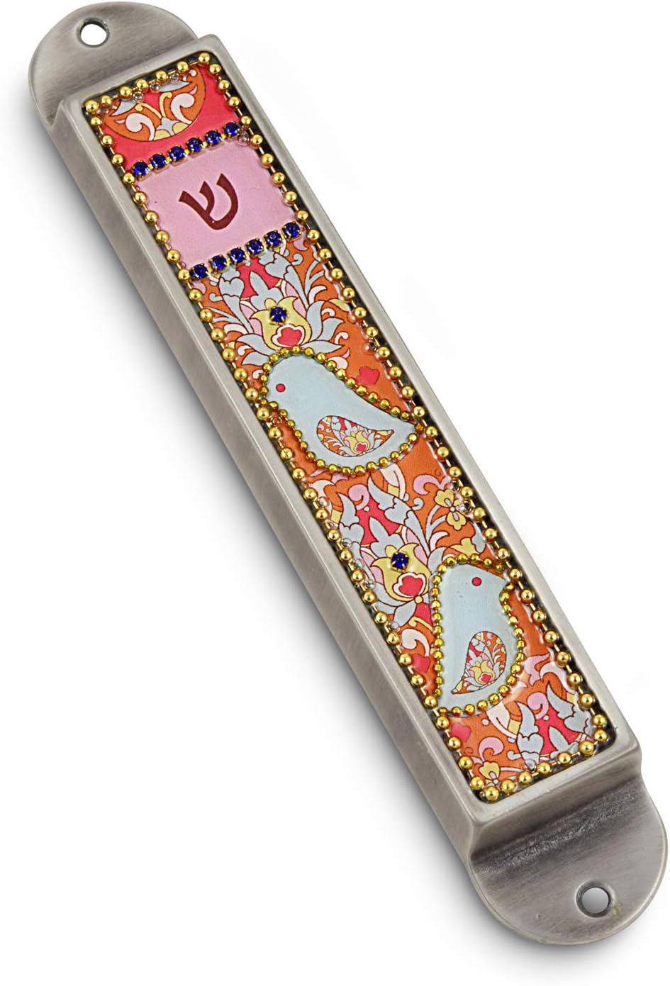 Bring the best of contemporary art to the traditional Mezuzah case. This exquisite hand painted pewter mezuzah case, from Iris Design in Israel, features a meticulous diamond design enclosing blue flowers on a delicate background framed with gold beads. A touch of luxury – the “shin” letter is enclosed in authentic gleaming Czech crystals. Scroll is inserted on reverse side. Use screws in designated holes to attach to doorpost.