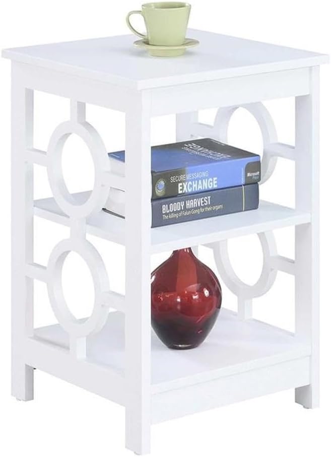 Unique and stylish; the Ring End Table by Convenience Concepts will bring your home decor to the next level. This contemporary piece displays a well thought out construction that combines a clean lined silhouette and two circle cut outs that adorn each of the side frames. It also features three ample shelves for all your storage and display needs. Showcase your favorite books or store your living room essentials; or why not do both! The versatility of this three tier unit is limitless. The shelves were crafted from particle board that is finished with melamine and non lead based paint; making them easy to clean. Frames and legs were fashioned from particle board and finished with non lead based paint; making them sturdy and long lasting. Add to your living room; entryway or to your den; and witness as this item enhances your current decor. Bring home today and enjoy its simple and fast 5 step assembly! Want the complete look? More furniture pieces from the Ring Collection by Convenience Concepts are available. They come in multiple finishes; ensuring the perfect fit for your home. Each sold separately.