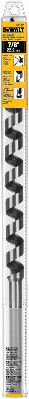 Product Description Professional contractors rely on DEWALT Power Ship Augers when they need to bore clean holes for wiring, pipes and more. These ultra-heavy-duty bits feature hardened dual cutting edges for durability against nail infested wood. Hollow center flutes eject chips quickly for fast cuts, while an aggresive self-feeding screw-tip pulls the bit easily through tough materials. Standard 7/16" Quick Change Shank allows for fast bit changes in quick change ready tools like the new 60V MAX* BRUSHLESS CORDLESS QUICK-CHANGE STUD AND JOIST DRILL (DCD471) while preserving backward compatability with chuck based tools. * Maximum initial battery voltage (measured without a workload) is 60 volts. Nominal voltage is 54 Available in sizes ranging from 5/8 in. to 1-3/8 in. diameter in both 6" lengths and 17" lengths. From the Manufacturer DeWalt DW1685 7/8-Inch by 17-Inch Ship Auger Bit