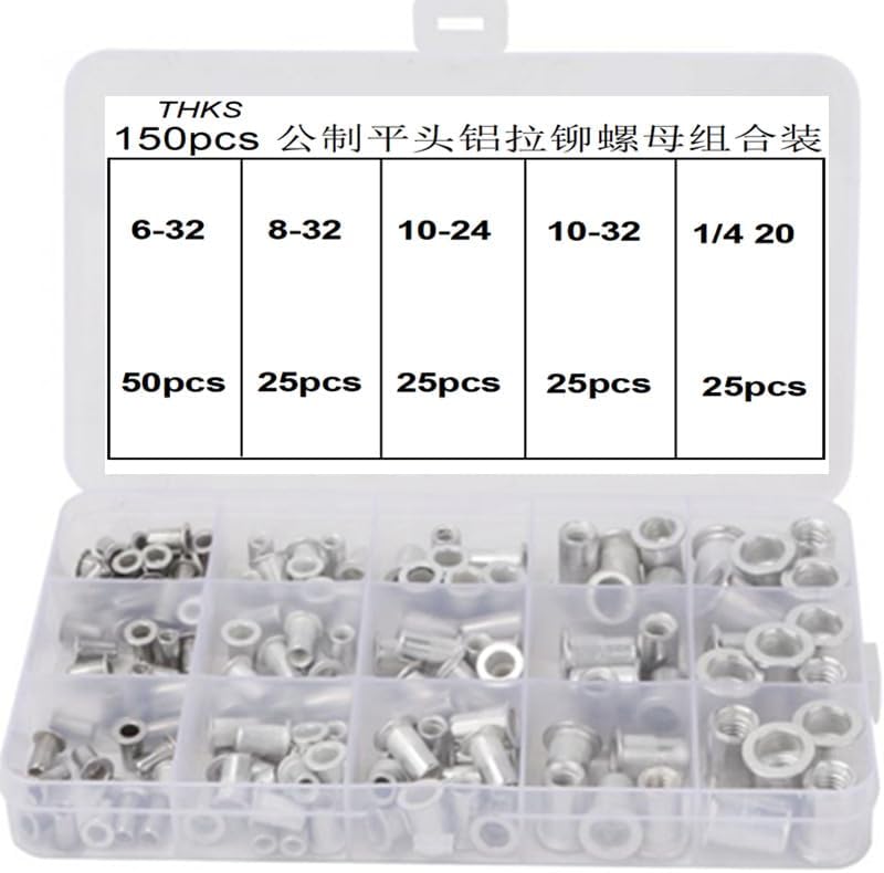 Carbon Steel Flat Head Threaded Rivetnut Insert Nutsert Aluminum Alloy Rivet Nut Assortment Kit - M3 M4 M5 M6 M8 M10 Product Name: Metric Flat Head Rivet NutsProduct material: AluminumProduct Quantity: 150pcsPackage includes:6-32: 50pcs8-32: 25pcs10-24: 25pcs10-32: 25pcs1/4 20: 25pcs Product Name: Metric Flat Head Rivet NutsProduct material: SteelProduct Quantity: 180pcsPackage includes:M3 50PCSM4 50PCSM5 30PCSM6 30PCSM8 10PCSM10 10PCSItem specifics:Is customized: YesModel number: RN1815Diy supplies: MetalworkingCertification: DotOrigin: Mainland ChinaItem type: Nut & Bolt SetsRivetnut: Alloy RivetRivet gun: Nutsert