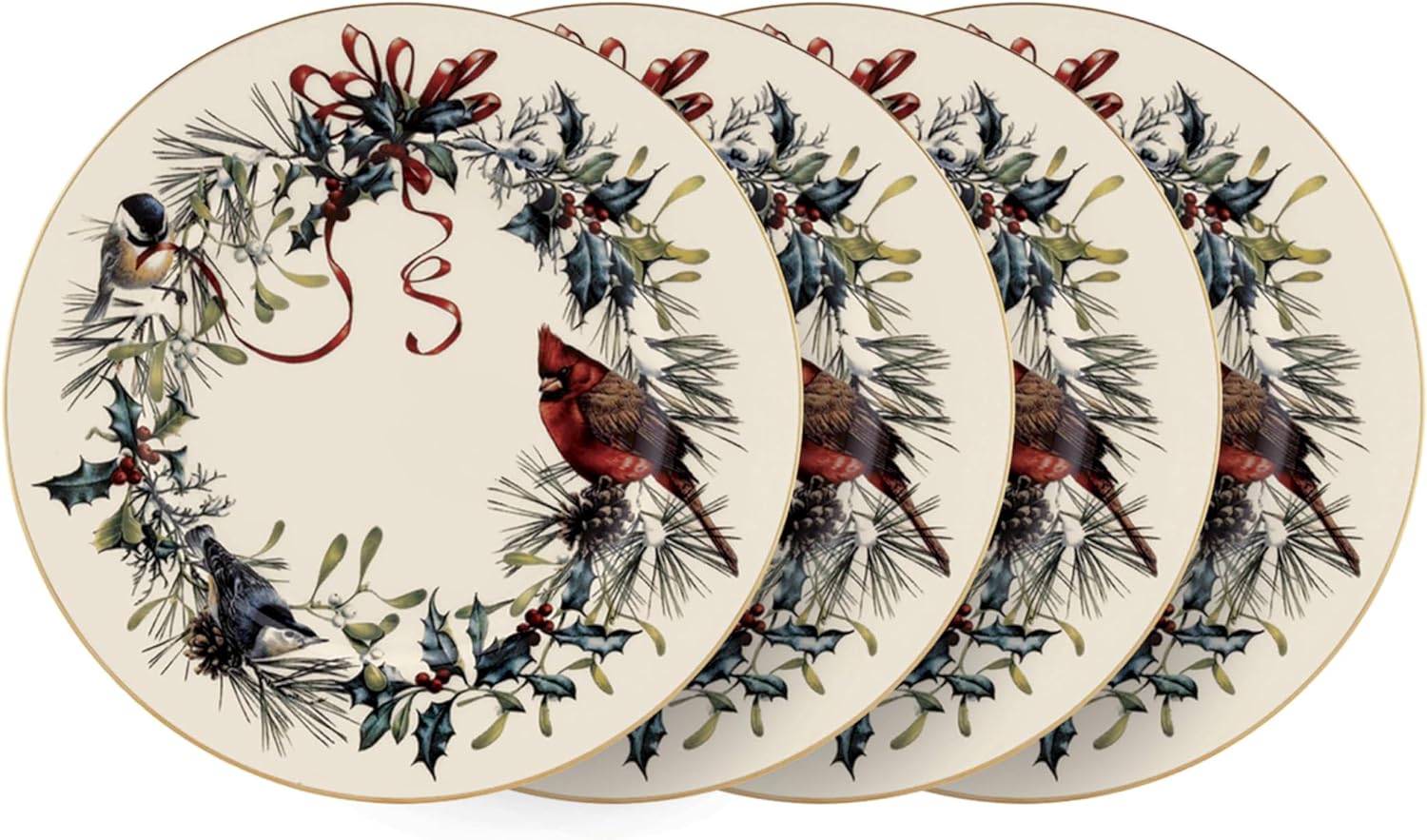 A wreath of red ribbon, holly and mistletoe frame a vibrant red cardina on this festive accent plate. Part of the classic Lenox Winter Greetings Collection, it's crafted from durable ivory bone china with a 24-karat gold trim. Made in the U.S.A.