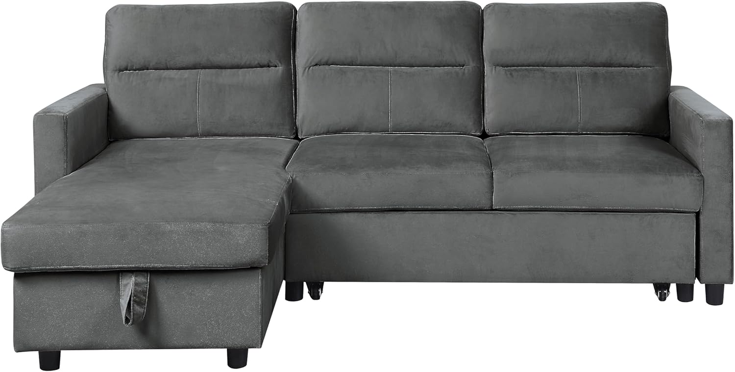 The two-piece sectional couch is easy to assemble and can be arranged to meet your needs with its reversible chaise. The pull-out bed saves space and is easily ready for your guests to use. Its velvet upholstery and foam filled seats provide comfort, while its storage chaise provides the perfect place to put away blankets and pillows along with the side pocket to store away magazines.