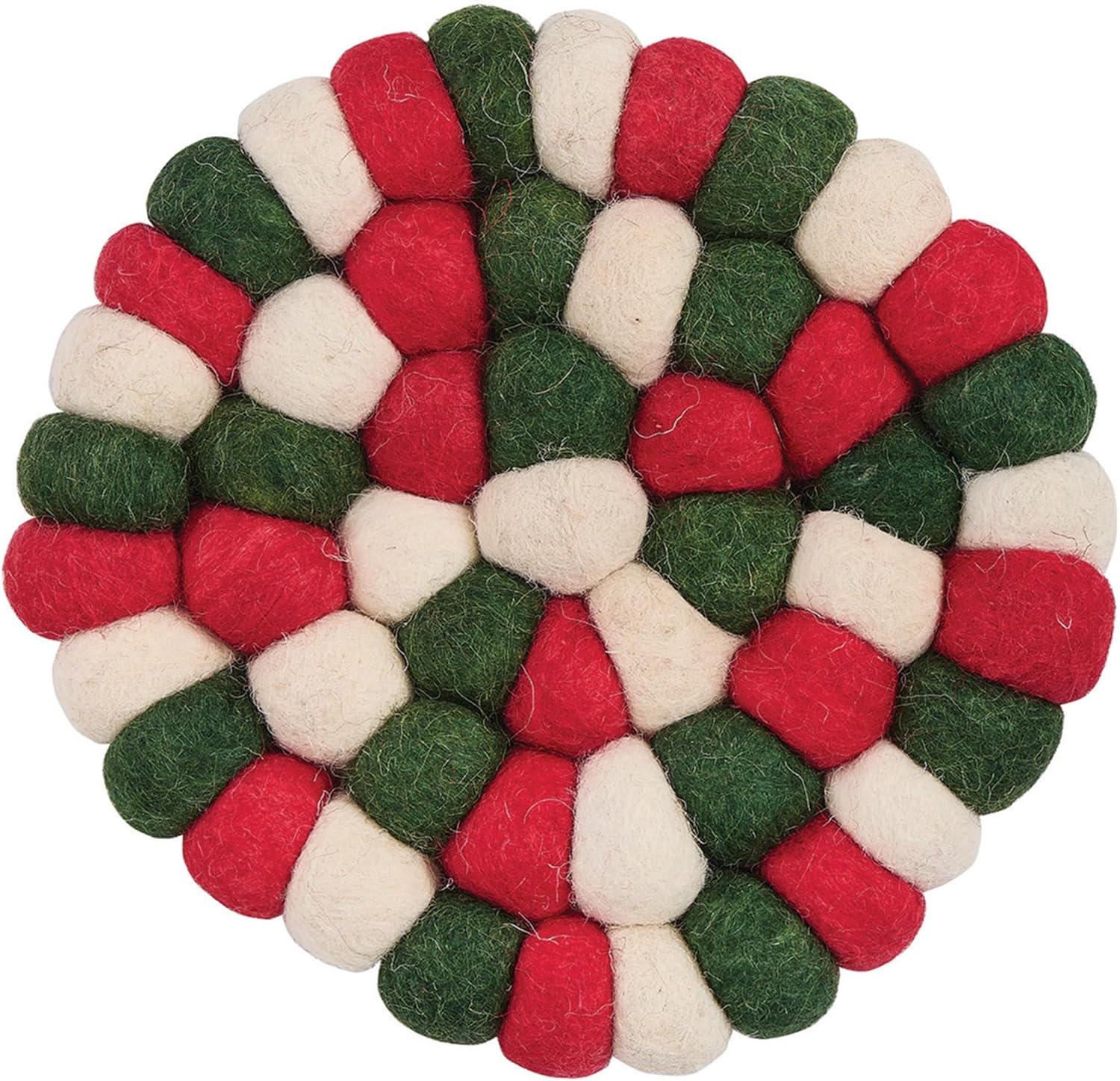Add texture and visual interest to your holiday kitchen or dining room setting with this functional hot pad set of three. The classic red, green, and white hues of the festive season brings a relaxing touch of versatile subtlety to your space, making it a stylish essential in any Christmas, winter, or holiday decor. Made of thick, wool balls that protect your dining table and kitchen counters from heat damage or water circles while hosting a dinner party or completing daily tasks like cooking, cleaning, or baking. This reliable tabletop tool makes every meal and party gathering a joyful experience while providing reliable protection and a decorative accent to boho and fall decor.