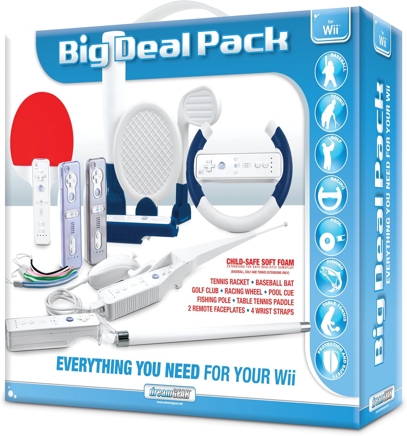 Tennis racket, baseball bat, golf club, racing wheel, pool cue, fishing rod, table tennis paddle, 2 remote face plates & 4 wrist straps