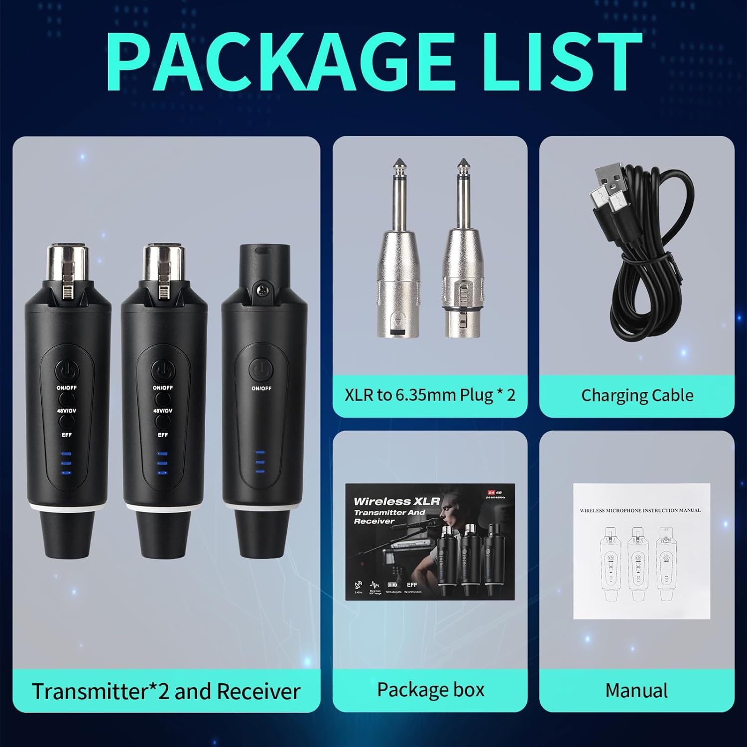 • What You Get: 1 x Receiver, 2x transmitter, 2 x XLR to 6.35mm plug, 1 x charging cable, 1 x user manual. Ideal for gigs, weddings, speeches, churches, conferences, content creators, home studios, and more.